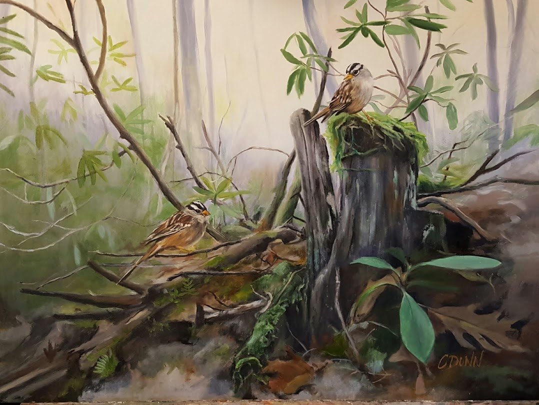 Sparrows have struggled through thorns in recent paintings, stared knowingly from Gothic window ledges, but here they rest playfully and at home on soft moss. Winter is coming, but as always, they are at peace.