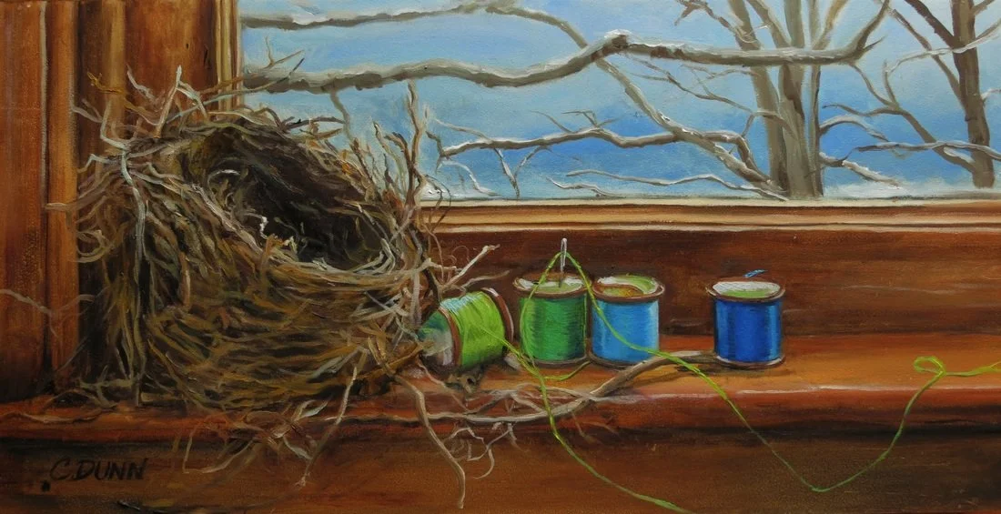 When I think of Makers, I think of my grandmother. She was a powerful Maker. Most things she made were transitory. She grew her family's food and put it up, She made a fire everyday in the wood cook stove and made dinner. She made sure her family ate, even if it meant she was hungry. She made clothes and made them clean. She made medicine, and made us feel better when we hurt. I remember once she pulled a bumblebee out of my hair with her bare hands. It stung us both, but in that act, she made it clear that I was sacred and loved. When you know that, nothing can hurt you. That kind of thing stays with you as long as you live. Something else she made that I still have are her quilts. When she was young, they were perfect, hand stitched, with colors carefully chosen and coordinated from the old clothes she cut into geometric patterns. But after she lost her eyesight, they were crooked and possessed a different beauty. Her quilts still hold magic. If I am having a bad day, I can wrap myself in one of them and feel the comfort of her love. No amount of money can buy that. This painting is about the making of a home, a nest, and the most important thing we can make and often the least appreciated, which is love.