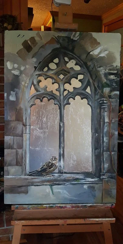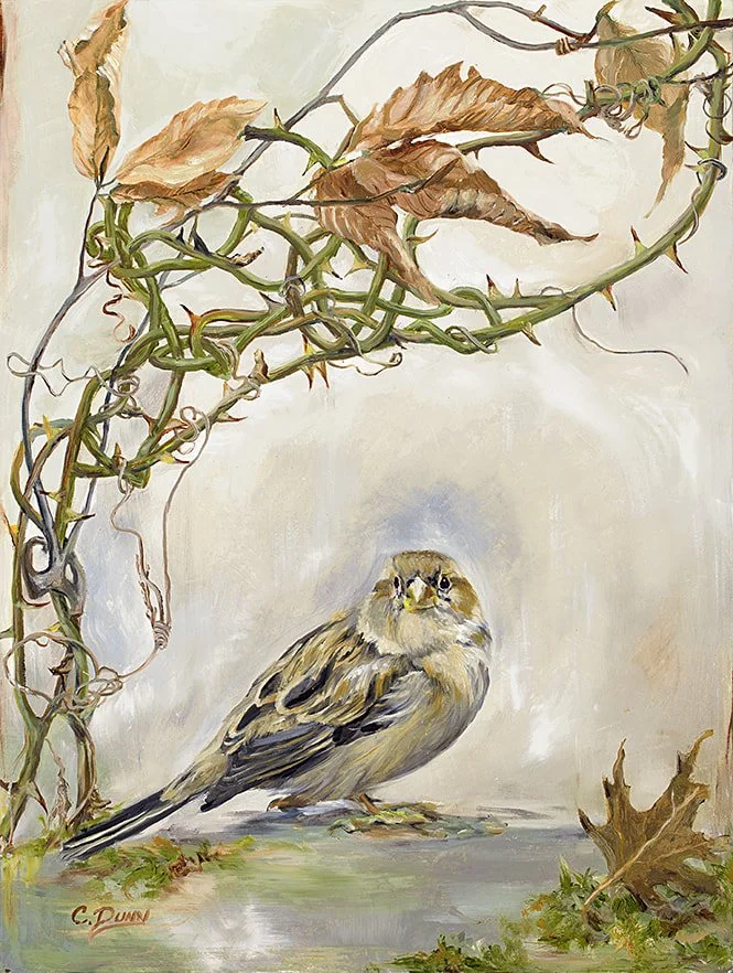 After about a year of feeling numb, I was really struggling with the pain of losing both grandmothers and consumed by grief. I didn't know how I'd pick up and go on. I found myself at my Grandma's grave, deep in prayer. It was January and patches of snow were on the ground. It started to get dark. I knew my kids needed dinner. I picked some moss and dried oak leaves off the ground and some orange birch leaves still hanging from a tree and headed home. Later that evening as I sat at the easel, I had an idea what I wanted to paint. But the birch leaves wanted to be in my painting, so I gave in and started with them. By the time they were done, thorns had decided they would be there too, and they would weave into a mass of celtic knotwork.. When that was done, the sparrow made his appearance, and again, there was peace. I started with an idea of what I wanted to paint, but the painting took on a life of its own and told me what it needed to be. This is the way that life works. We can let go of trying to understand, trying to work it out or control anything. We can trust that God will provide for our needs, and in His infinite wisdom, He has a plan that is greater than we could ever begin to understand.