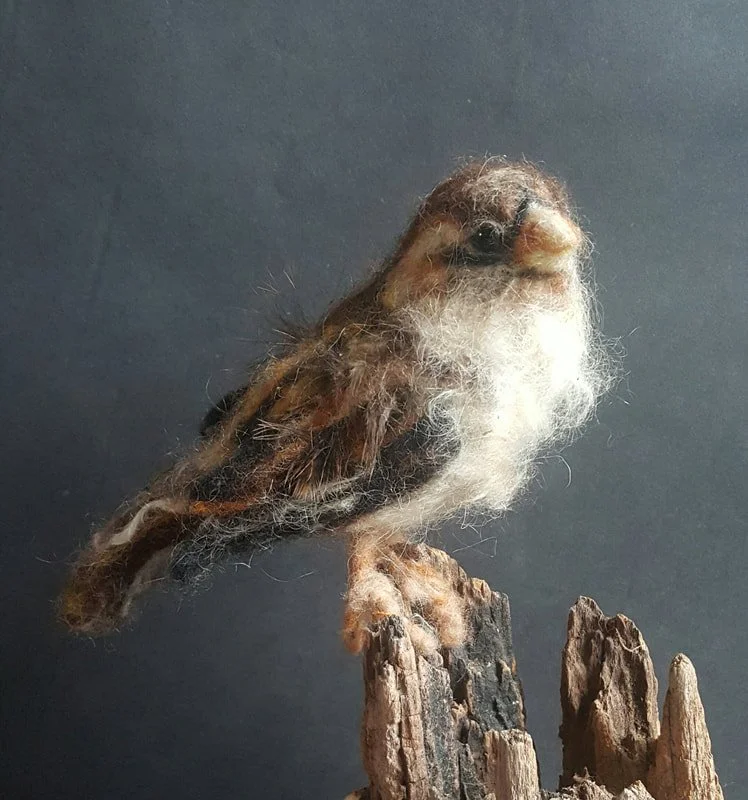 The Sparrow came back the day of Shane's funeral. And this is where it gets powerful. I was taking the sketch and a portrait of Shane to Dan, the funeral director, so that he could set up for the service. As I opened the back door to load the artwork, a sparrow flew up out of the back seat, hovered in the air, looked me in the eye, and flew out the open window on the other side. From that moment, I was lifted up and filled with a peace that is beyond understanding. I didn't shed another tear that day. Over the next few days, I created a felted wool sculpture of the sparrow.