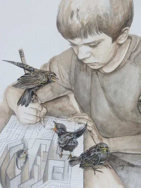 This is my youngest son, Jackson. I found him drawing this maze and was compelled to paint his process. As I worked, fledgling blackbirds found their way into and out of his maze. Blackbirds have a rich and ancient symbolism that relates to creation and the discovery of one’s artistic voice. The peoples of the Pacific Northwest tell how at the beginning of the world, Raven was the one who brought light to the darkness. The Celtic Sun God, Lugh, who is creator of the arts and sciences, was closely associated with ravens, his name derived from a Celtic word for “crow.” In the Druidic legend, the blackbirds of Rhiannon are three blackbirds that sit and sing in a World Tree. Their song was said to impart mystic secrets and put the listener into a deep sleep which enabled her to travel to the Otherworlds. Likewise, the artist learns to travel between the world of the here and now and a world that is unseen, a world in which his very conscience can be reordered and he can be made whole through his communion with the Creator.